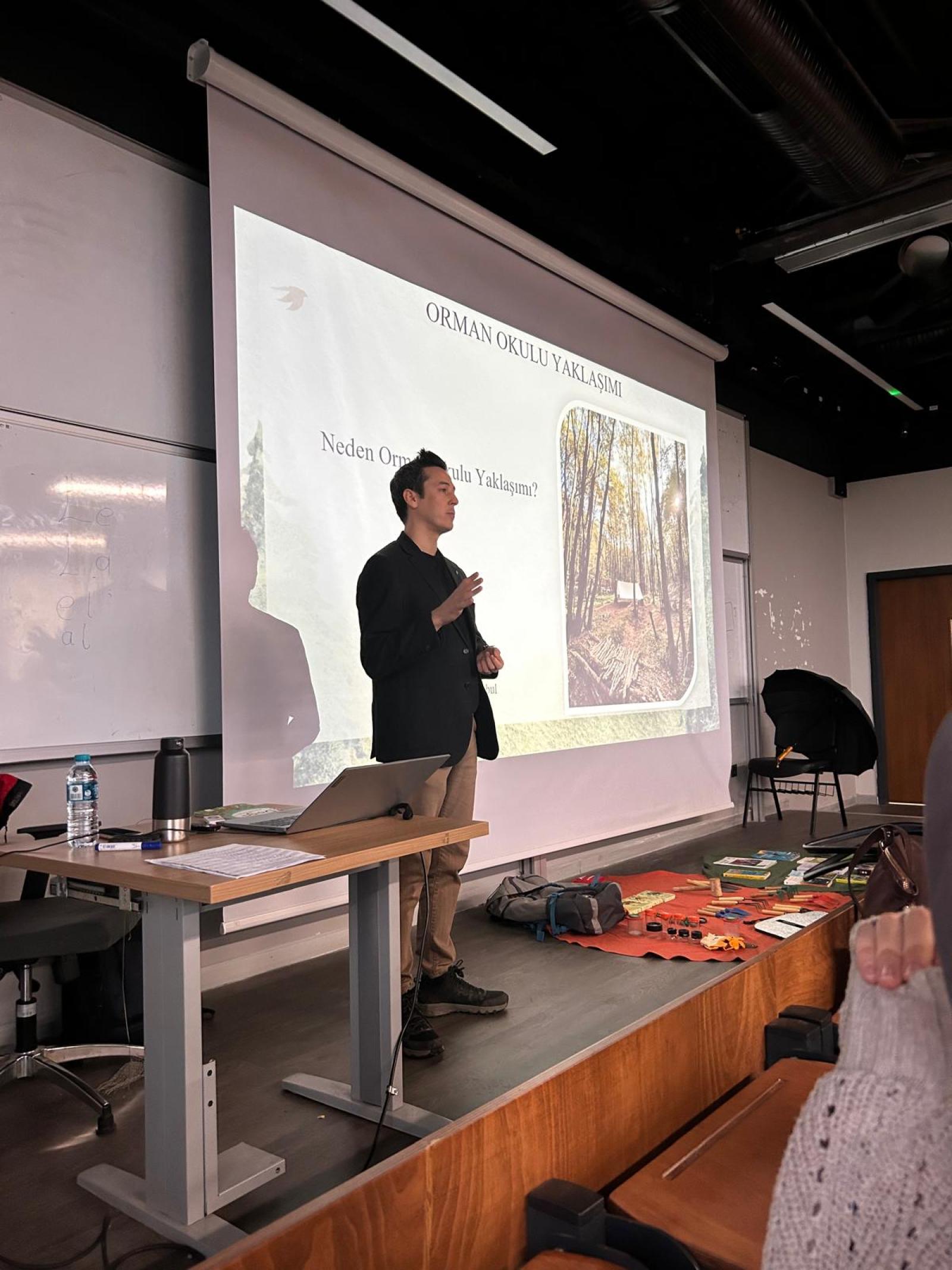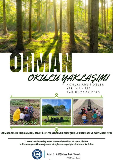 "Orman Okulu Yaklaşımı" Konulu Eğitim Yayın Tarihi: 07 Ocak 2026 "Orman Okulu Yaklaşımı" Konulu Eğitim Doktora öğrencimiz Abdil ÖZLER, 23 Aralık 2025 tarihinde öğretmen adaylarımıza “Orman Okulu Yaklaşımı” konulu bir eğitim vermiştir.